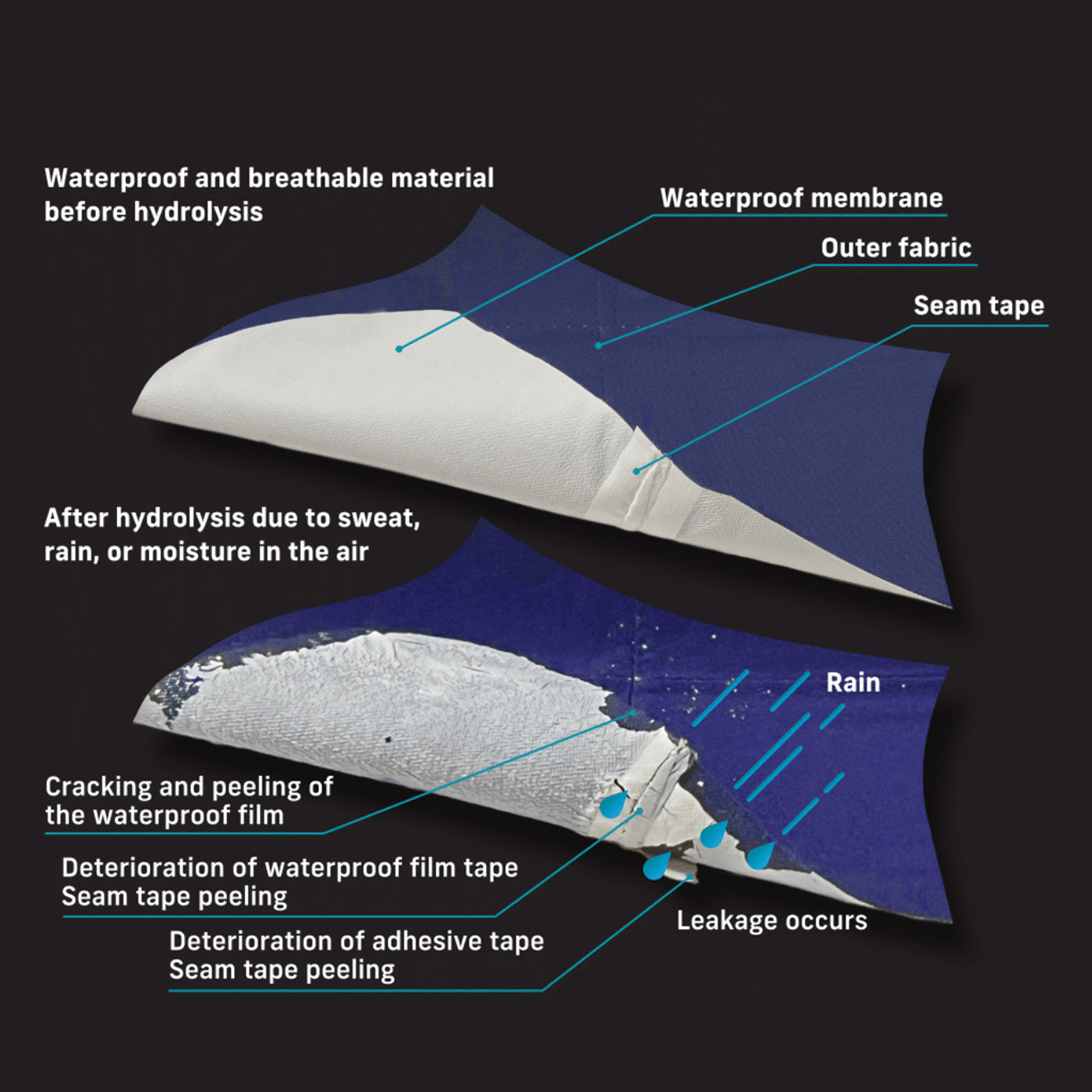 Hydrolysis is a decomposition reaction that occurs when water, such as sweat, rain, or moisture in the air, acts on a compound. The resin material used for waterproof membranes and seam tapes from other waterproof and breathable gear has water resistance but is easily hydrolyzed. When hydrolosis occurs, it becomes tattered and peels off or the surface becomes sticky. The hydrolyzed compound decomposes, and the damage has been done.